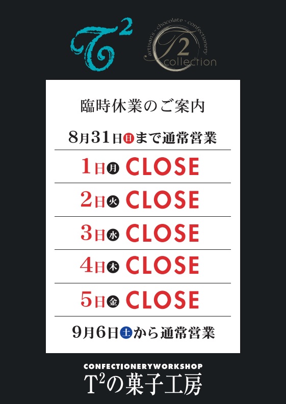 9月1日(月)から9月5日(金)まで 臨時休業させていただきます。 この期間はご予約等承ることができませんので 何卒宜しくお願い致します。